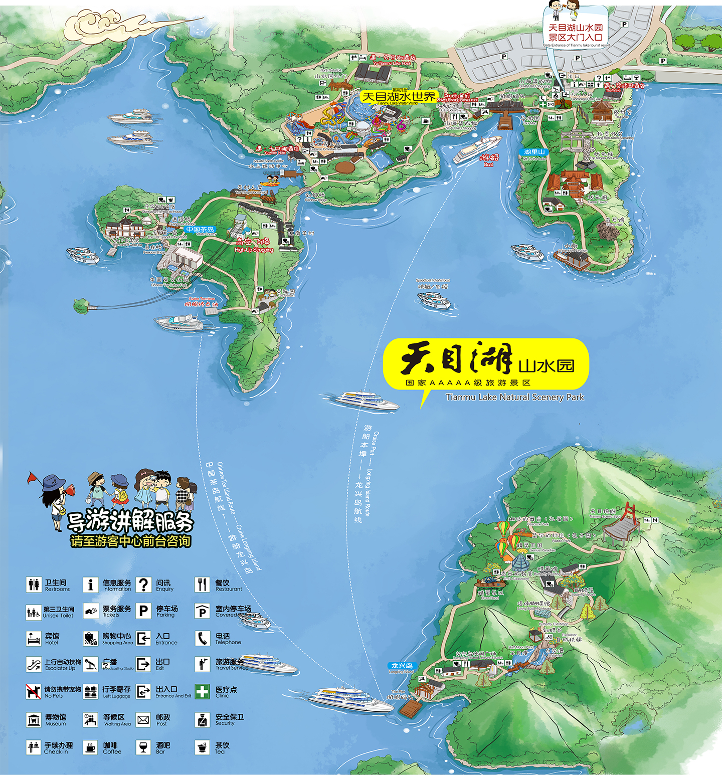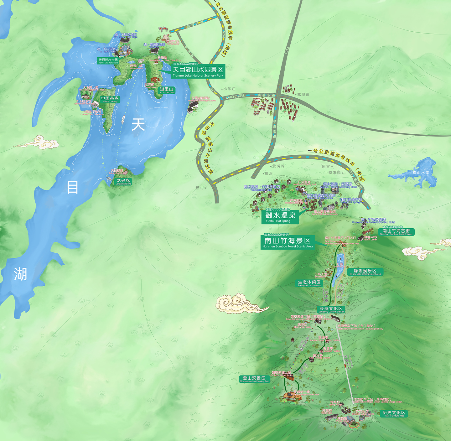 天目湖山水园,中国茶岛、龙兴岛、湖里山,游船赏湖,观精致山水。天目湖南山竹海,35000亩翠竹,天然氧吧,荟茎竹文化盛宴,地面缆车,穿梭林间,江南山居风格的鸡鸣古村,一脚踏三省,揽万亩竹海入胸怀。天目湖御水温泉,中国十大温泉,竹海森林里的温泉,自然精粹,御尊SPA,极致奢华体验,养生典范。